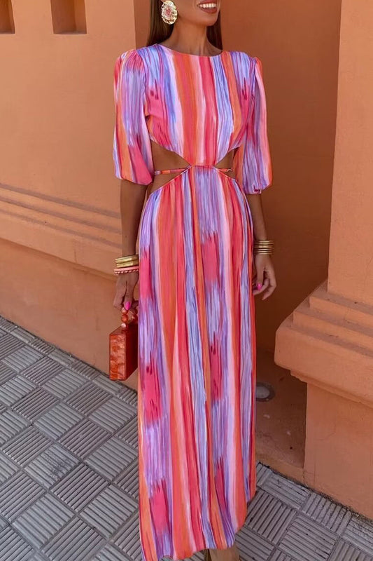 Sexy Gradient Color Lace Up Backless Contrast O Neck One Step Skirt Dresses