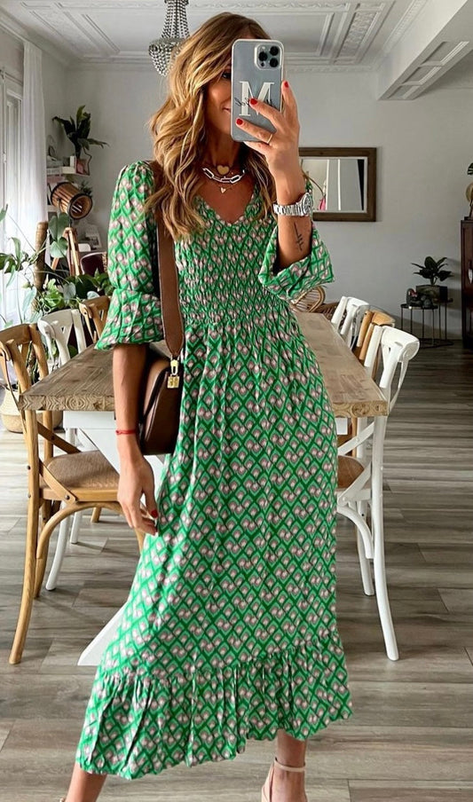 Women's Autumn Printed V-neck 3/4 Sleeve Dress
