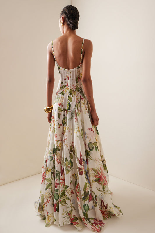 Andrea Floral Applique Pleated Chiffon Maxi Dress