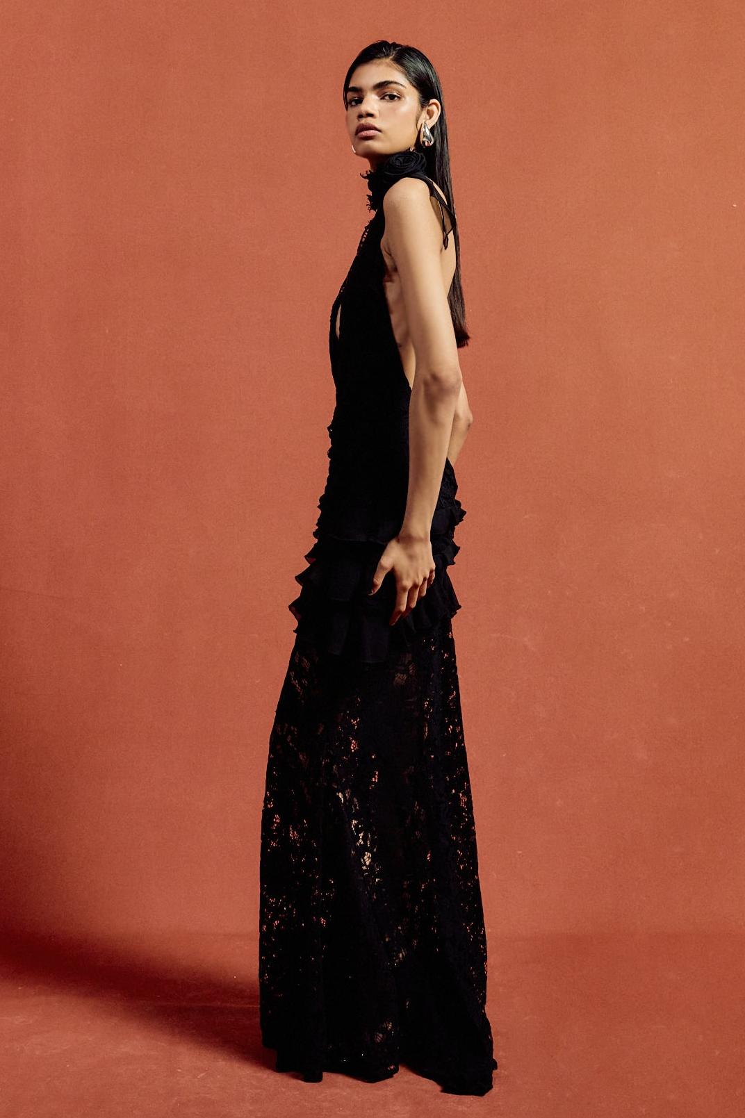 - Sleeveless, 3D flower, frill, solid color, black, maxi dress