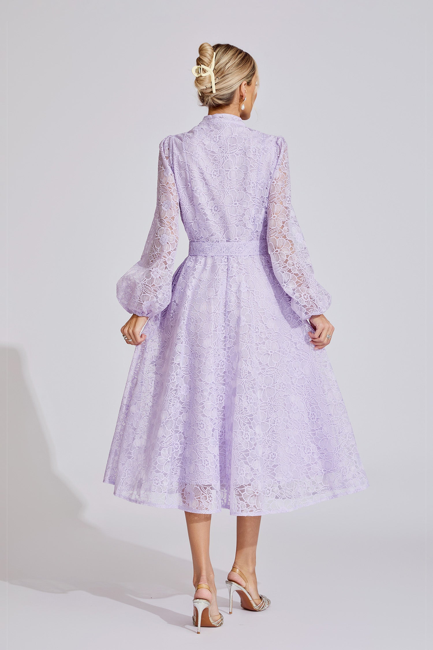 Embrace timeless French elegance in this exquisite lavender lace maxi dress, where delicate craftsmanship meets romantic design. The refined stand-up collar and single-row button detailing create a sophisticated silhouette, while the wide matching belt accentuates the waist for a flattering fit. Crafted from intricately embroidered lace with a lightweight, breathable lining, this A-line gown drapes gracefully to the ankle—perfect for garden parties, weddings, or special occasions where effortless charm shines.