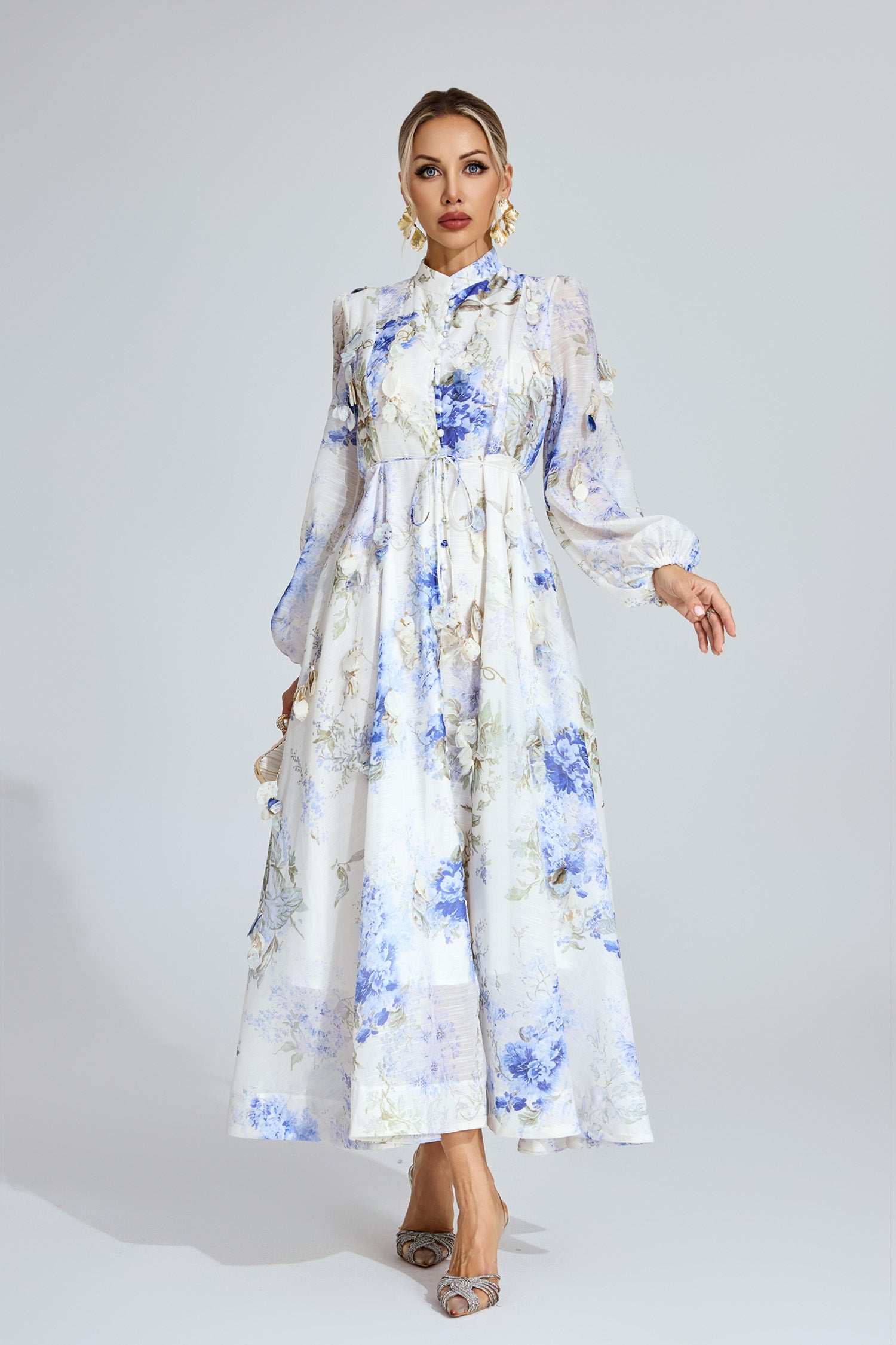 Elevate your elegance with the Cecil Floral Organza Maxi Dress. It features sheer balloon sleeves, delicate 3D floral accents, a high neckline, and a waist - cinching tie. The flowing organza fabric and pastel floral print create a dreamy, sophisticated silhouette—perfect for garden weddings, special events, or any occasion to embrace timeless beauty.
