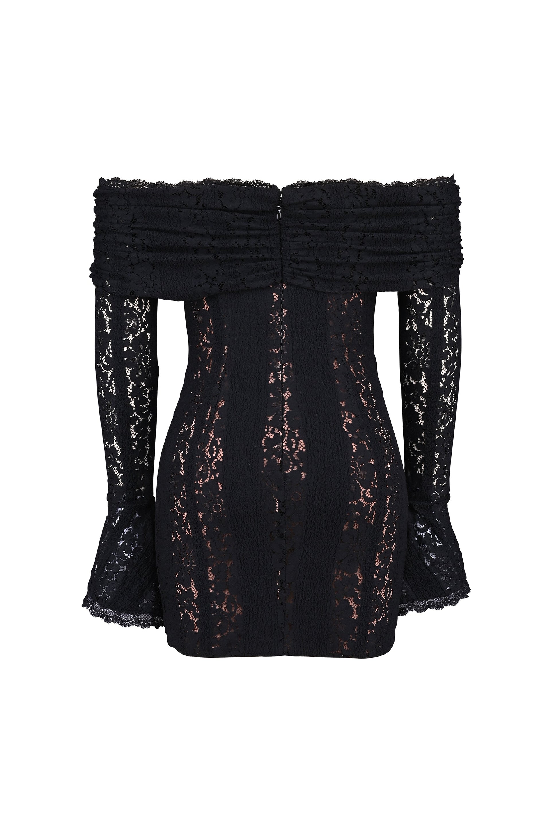 Long Sleeves, Flared Cuffs, Off Shoulder, Cut-out Detailing, Straight Hem, Floral Lace, Midi Length.