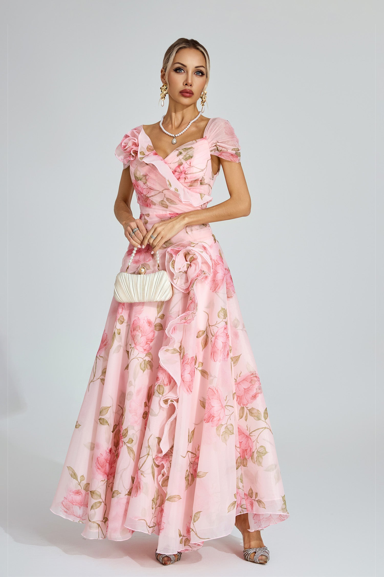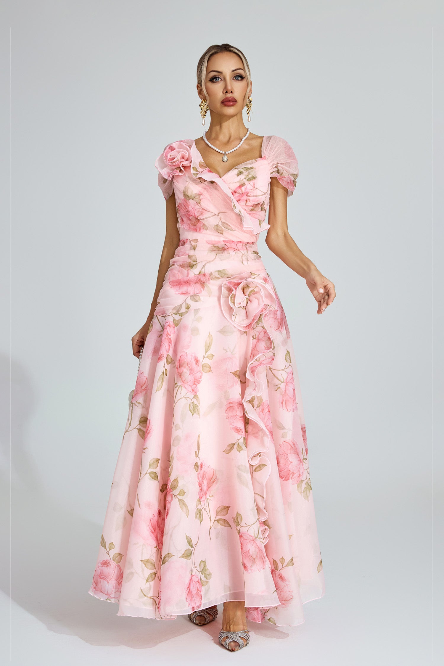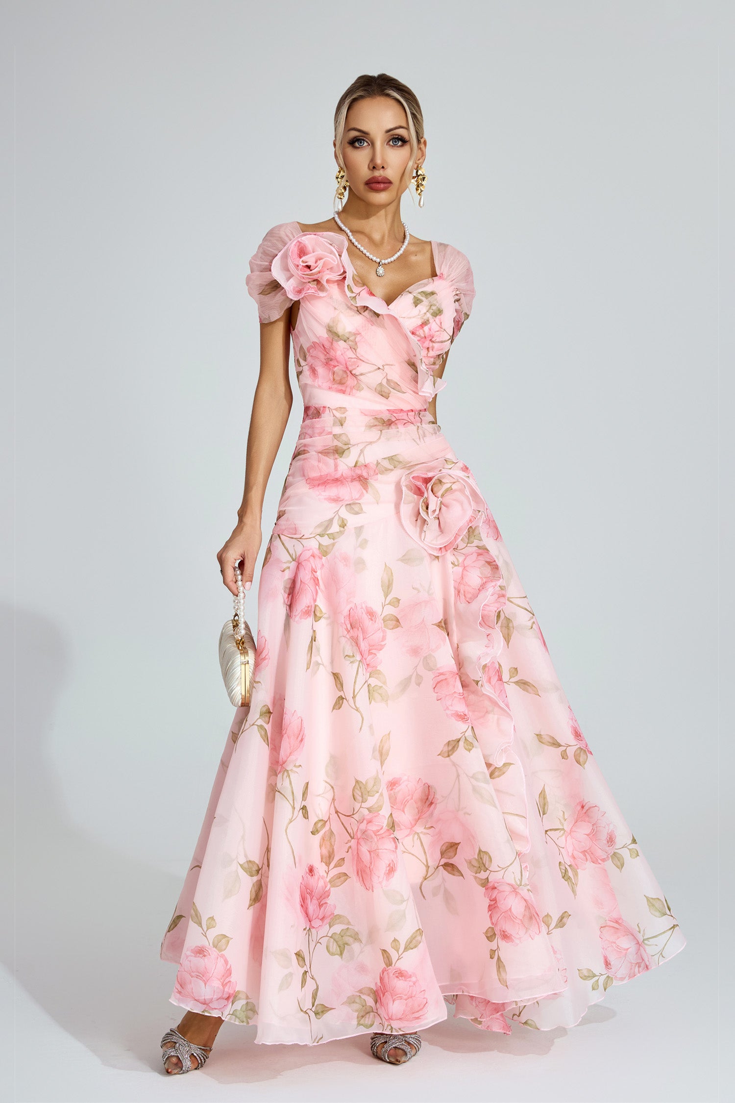 Radiate romantic charm in the Muriel Pink Floral Organza Dress. This ethereal maxi dress features delicate pink roses, 3D floral accents, ruffled sleeves, and a form - flattering silhouette. The sheer organza fabric and intricate details create a dreamy, feminine look—perfect for weddings, garden parties, or any occasion to embrace timeless elegance.