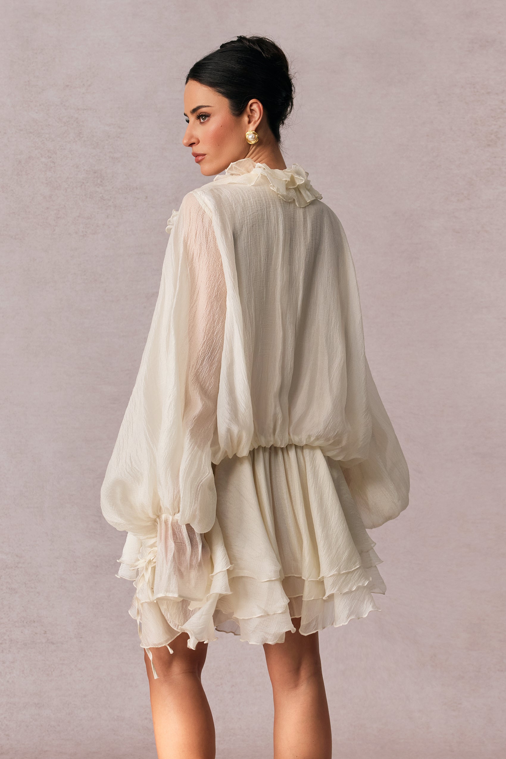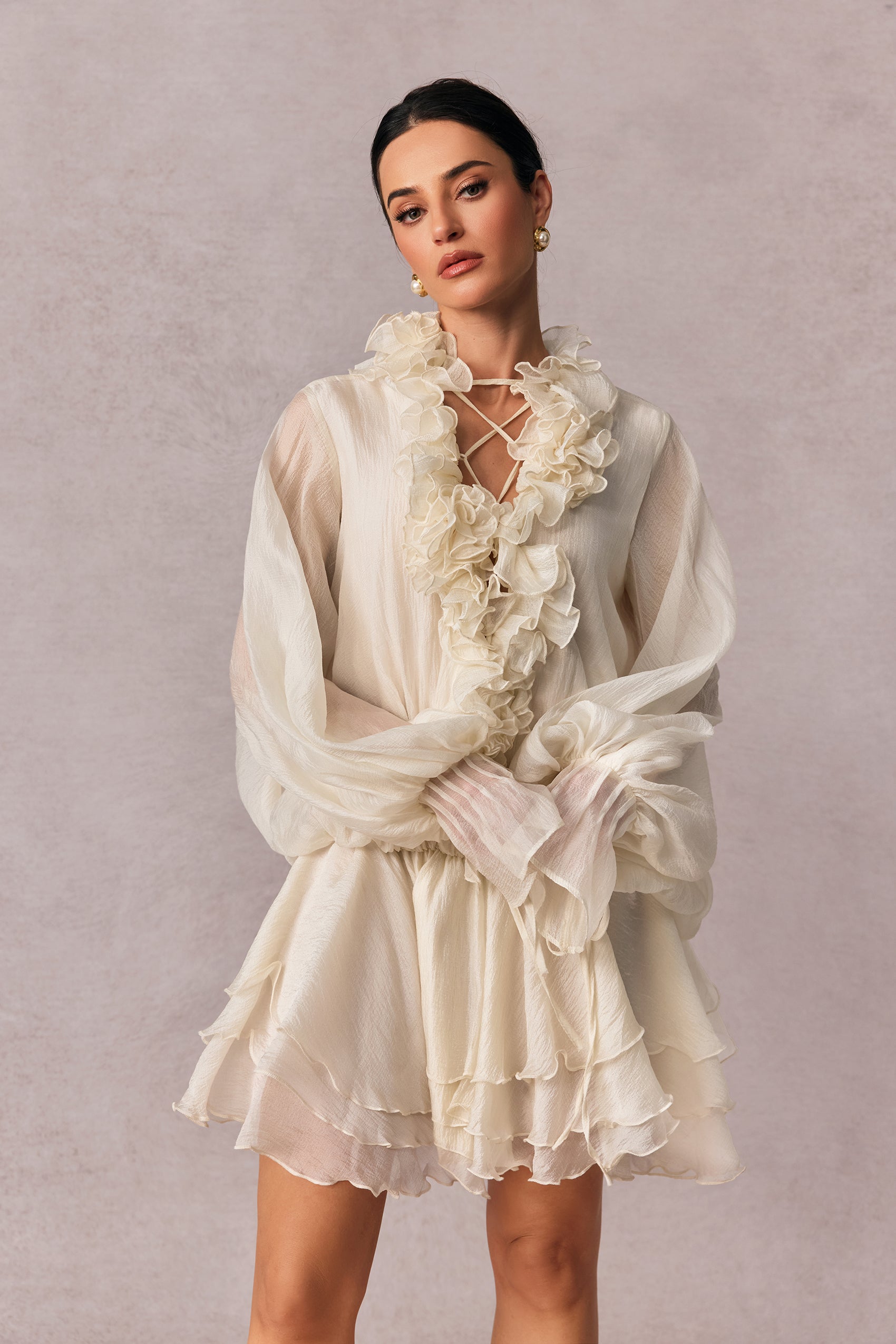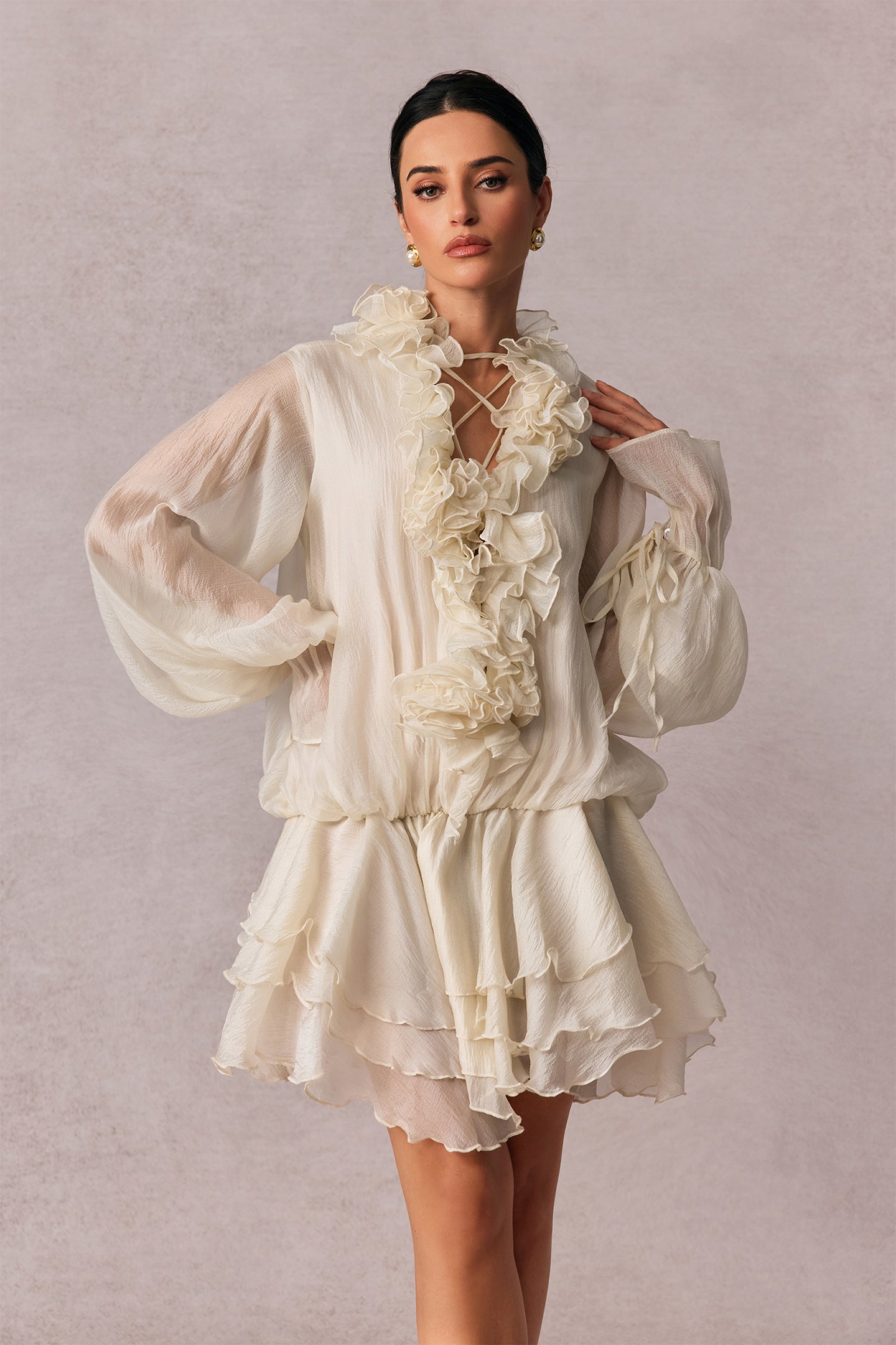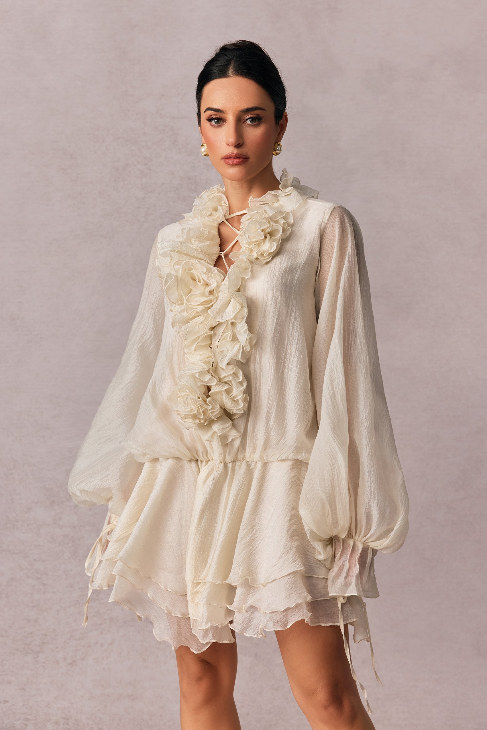 V-neck, Dramatic Puff Sleeves, Flared Cuffs, Semi-sheer, Floral Appliqué, Ruffled, Tiered Skirt, Elastic Waist Band, Low Waistline, Mini Length.
