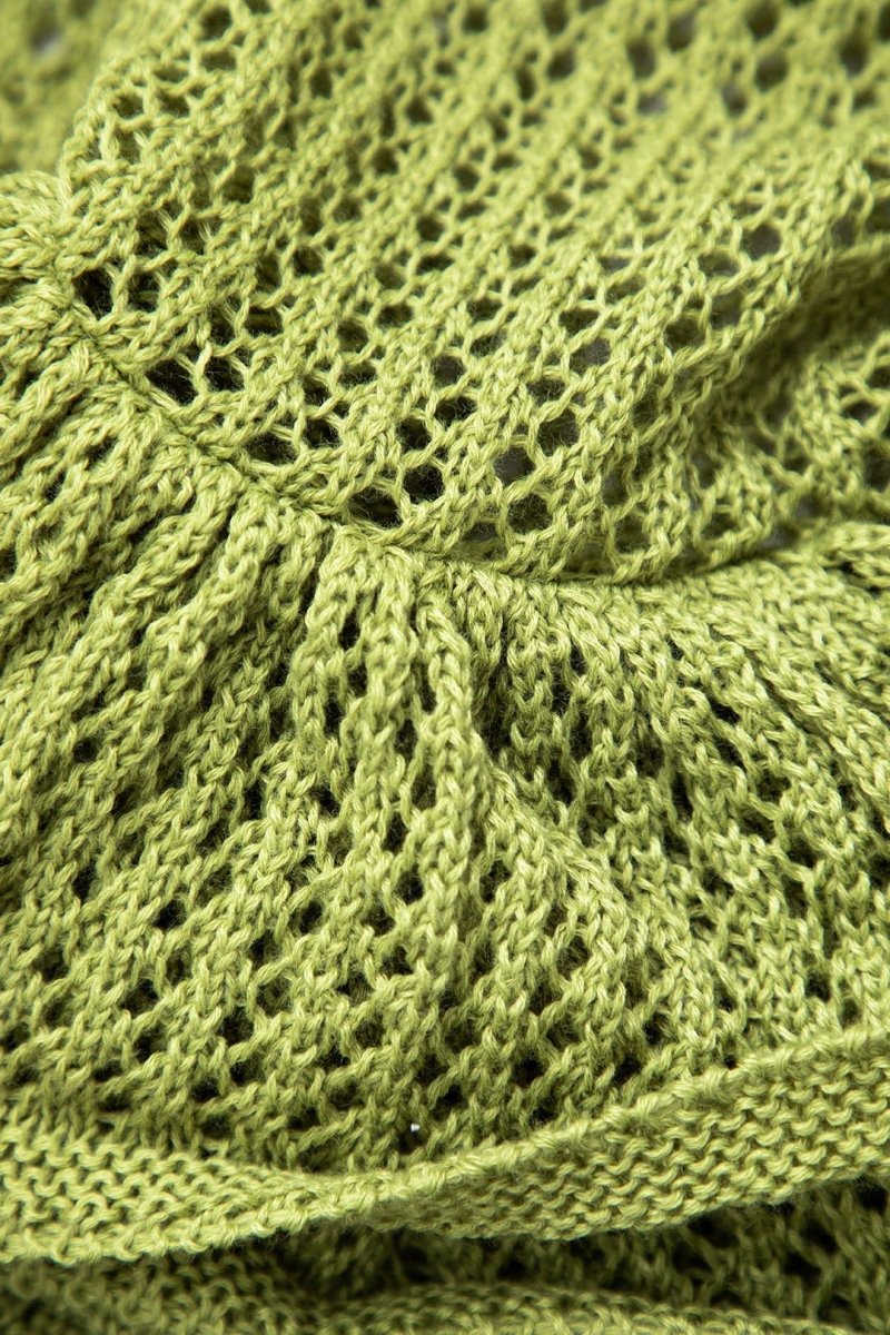 - V-neckline, Sleeveless, Crochet Detailing, Ruffle Accents, Slight Flare, Mini Length.