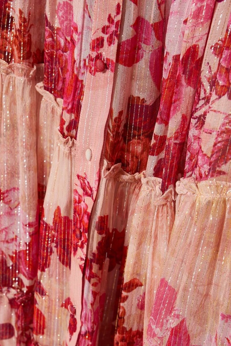 - Long Sleeves, Floral Pattern, Ruffles, Stand-up Neckline, Maxi Length.