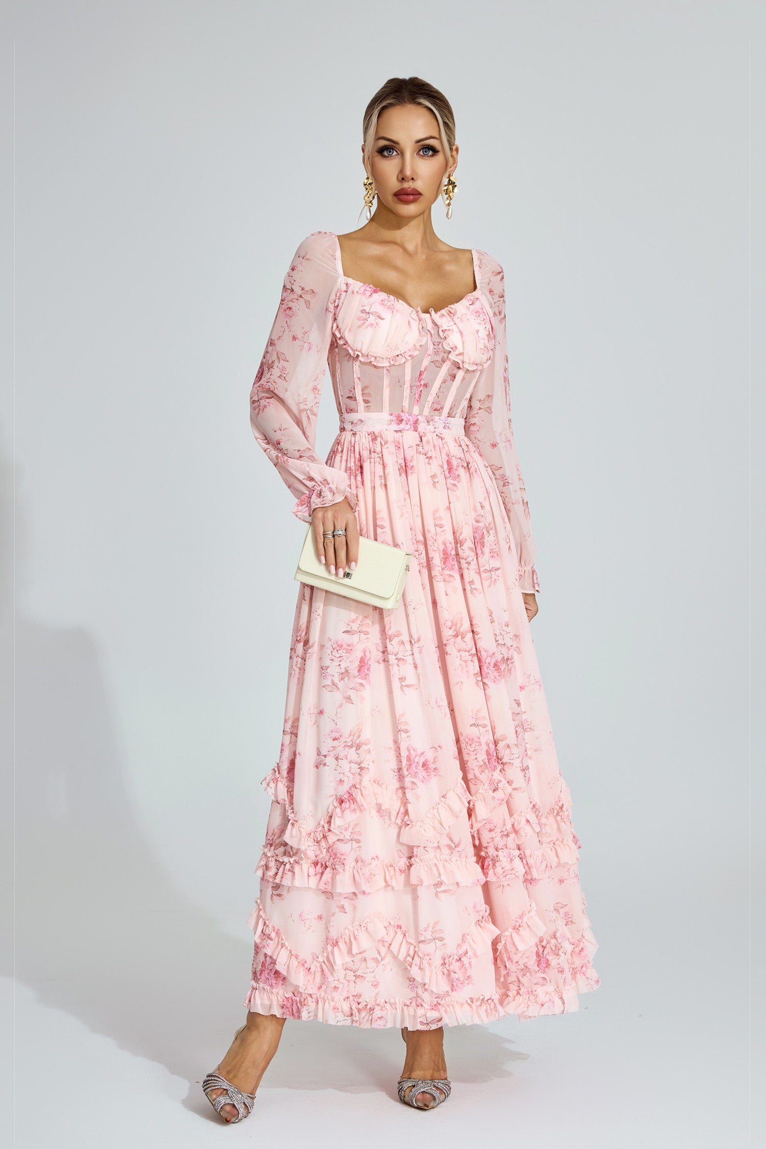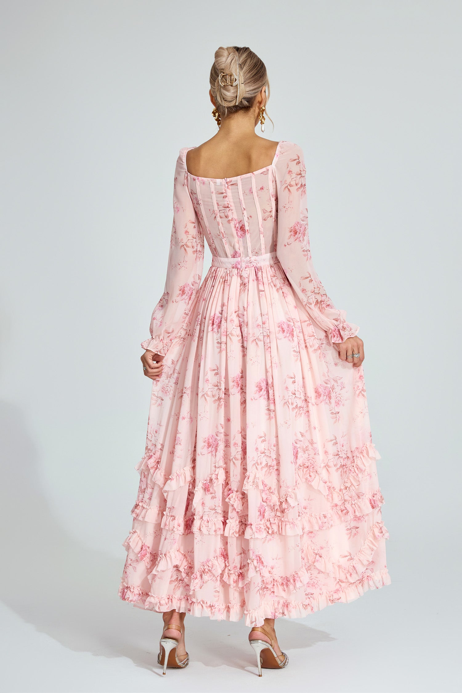 Elevate your romantic wardrobe with the Walkley Pink Floral Chiffon Maxi Dress. It features a square neckline, puff sleeves, a corset - inspired bodice, and a tiered ruffled skirt. The delicate pink floral print and flowing chiffon fabric create a dreamy, feminine silhouette—perfect for garden weddings, brunches, or any occasion to embrace timeless elegance.