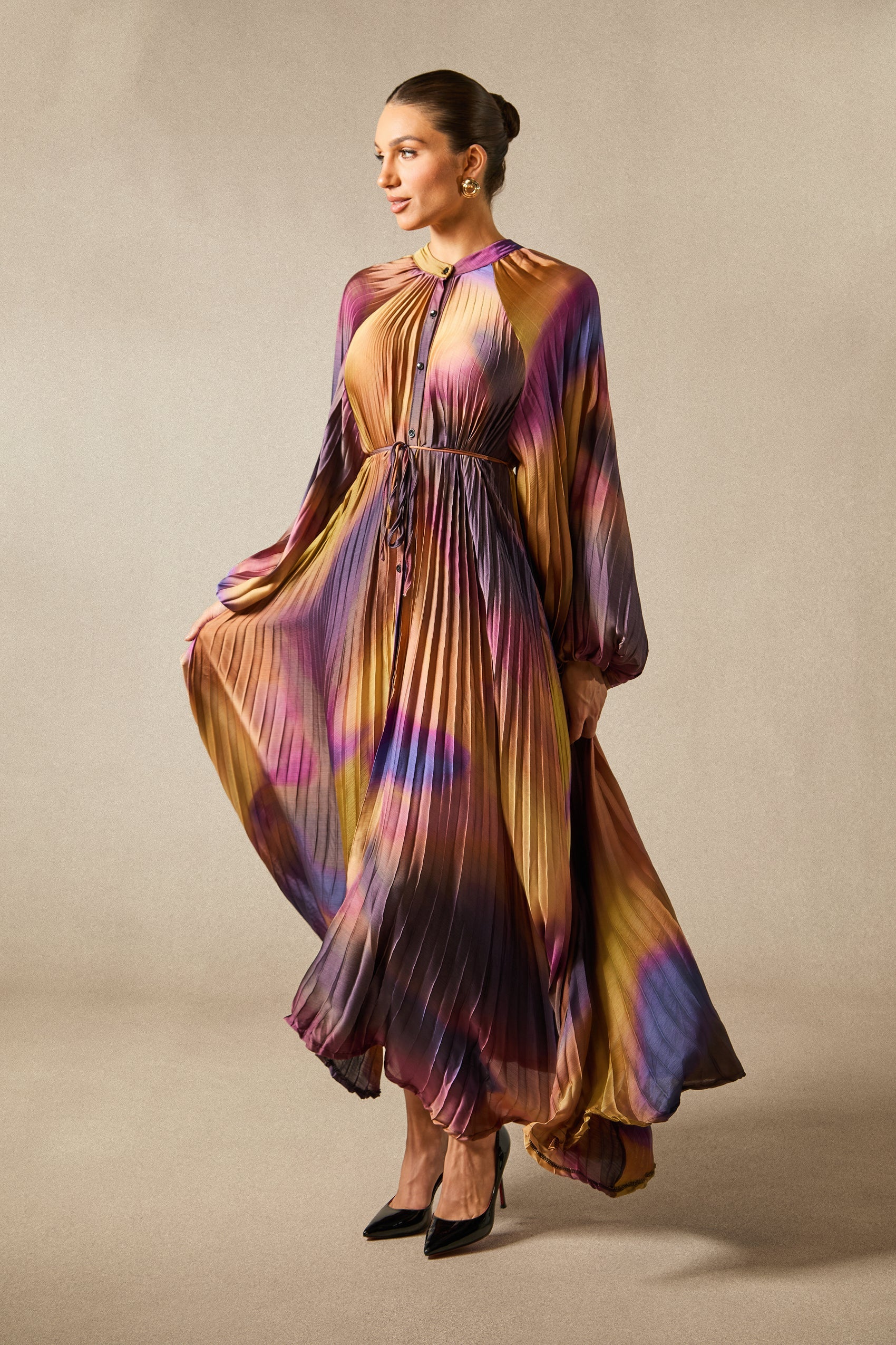 Balloon Sleeves, Pleated, Tie Waist Belt, Maxi Length.